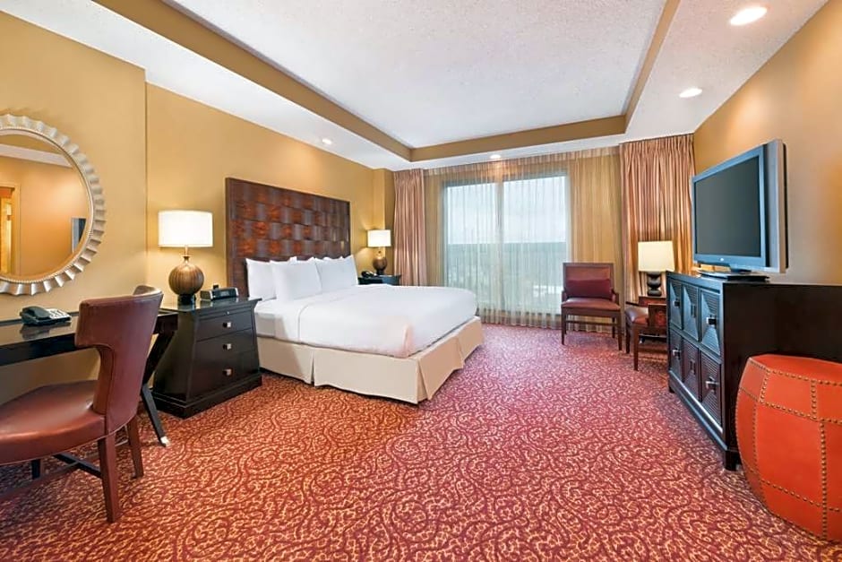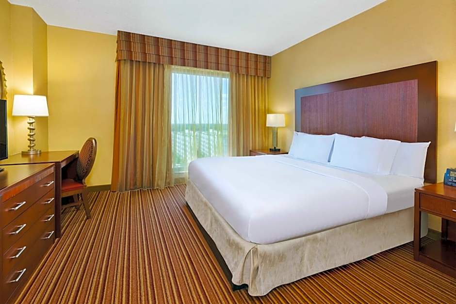 This suite features a microwave, refrigerator, and coffee-making facilities. It is mobility and hearing accessible and includes a roll-in shower.